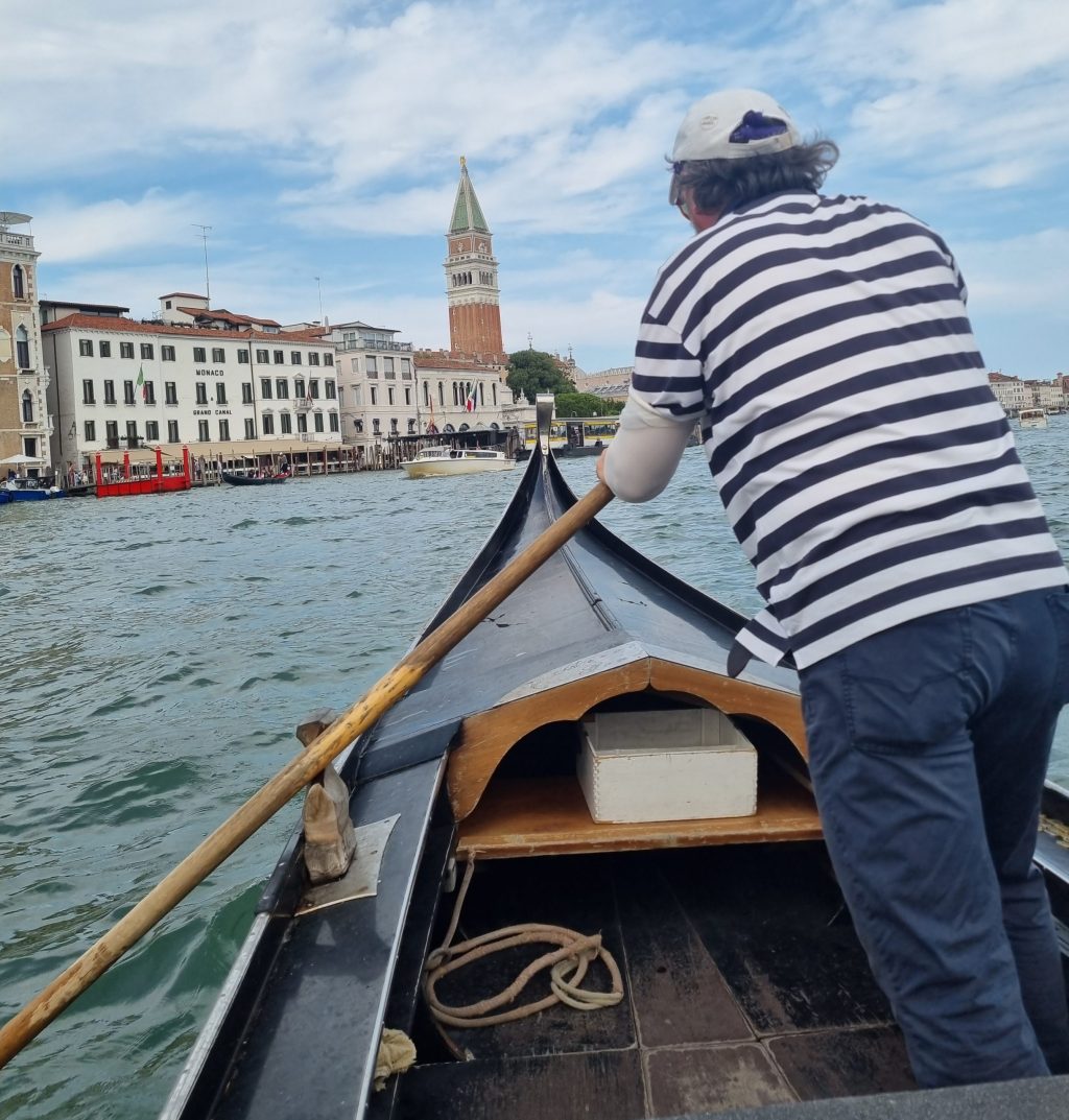 La costruzione di una gondola segue procedimenti molto rigorosi. Ogni elemento è importante ed ha un valore simbolico. Il ferro sulla prua serve a bilanciare il peso del gondoliere ed ha una forma che ricorda il cappello del doge e il Canal Grande. I 6 denti rappresentano i sestieri. Quello rivolto all’indietro, l’isola della Giudecca. Il gondoliere voga con un solo remo, in piedi dalla parte opposta alla prua. Nel caso delle gondole traghetto, i gondolieri sono due. La barca è leggermente asimmetrica, naviga quindi un po’ pendente su un lato.